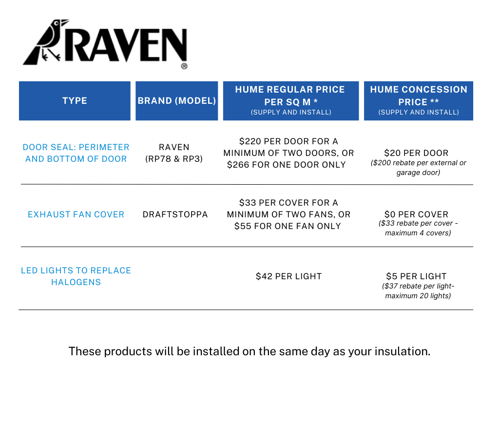 Door seals (Raven RP78 and RP3): $20 out-of-pocket per door, with a Council rebate of $200 per door. Maximum of 3 external or garage doors.
