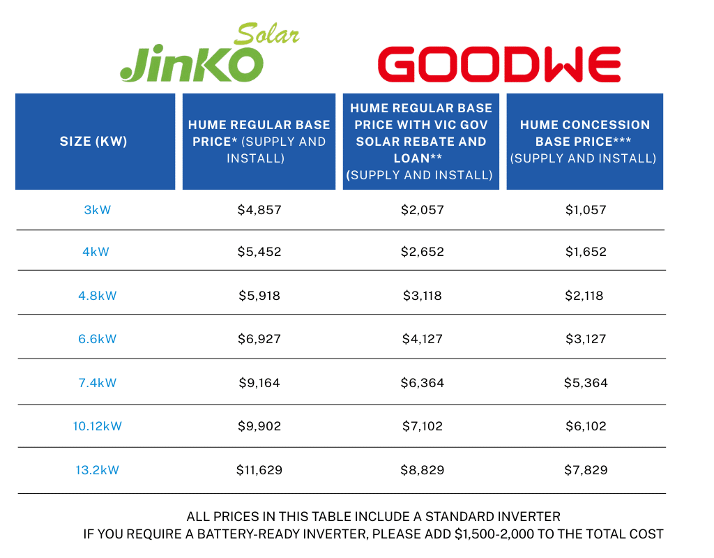 **Hume regular price with Victorian Government solar rebate and loan: Price includes the Victorian Government $1,400 solar rebate and $1,400 optional, no interest loan. The rebate doesn’t require repayment, however the loan is to be repaid over 4 years or can be repaid sooner. If paid off over four years, the monthly repayment is less than $30 which is usually less than electricity bill savings.
